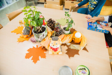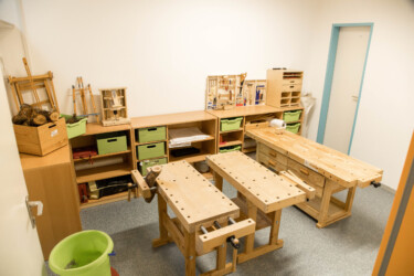 In the basement is our gymnastics/exercise and music room as well as the wood workshop, where the children can build or craft things they find in the forest or similar natural materials. Tools are also available for this, which they can use together with the educators.