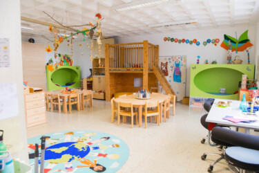 On the upper floor are the group rooms for the Butterfly and Rainbow groups, each with 16 children. The groups are each equipped with separate sanitary areas. There is also a kitchen on the upper floor, as well as a staff toilet with a changing table.
